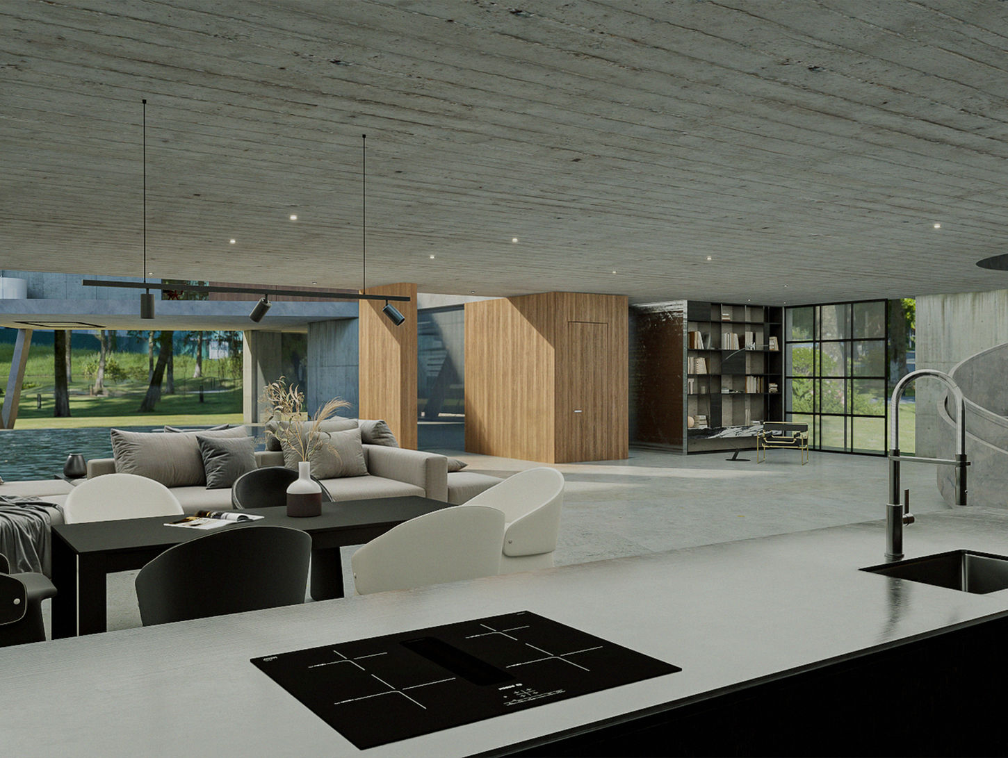 This living space blends retro charm with modern minimalism, featuring a raw concrete ceiling, clean-lined furniture, and subtle vintage accents for a timeless, understated vibe.