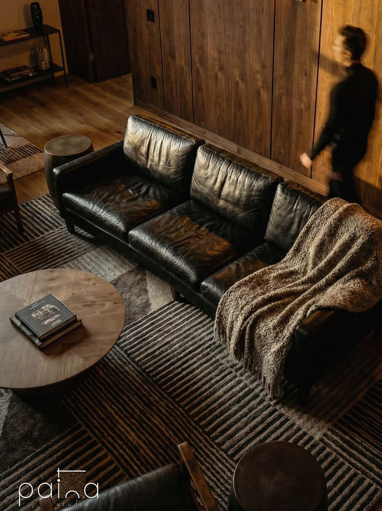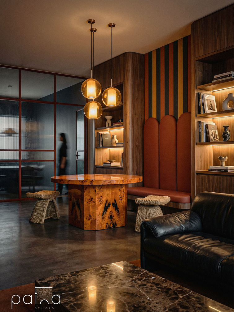 A rich, atmospheric interior defined by deep wood tones, warm ambient lighting, and bold material contrasts. The space feels intimate and refined, where layered textures, soft glow, and curated details create a cozy yet sophisticated modern living environment.