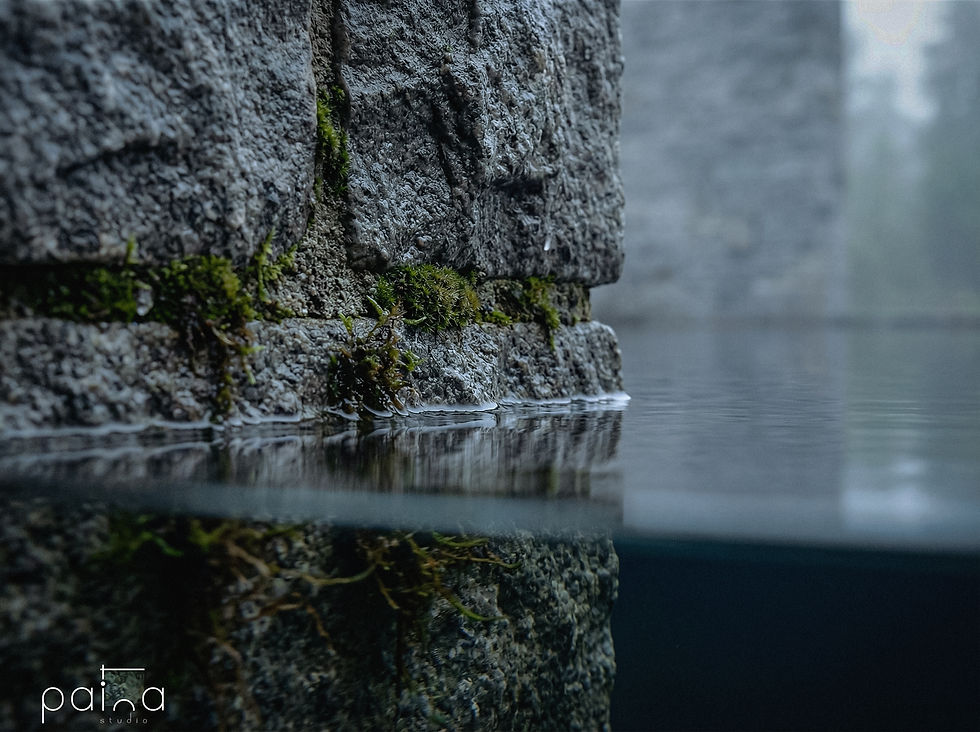 A quiet, introspective space defined by raw stone textures, soft diffused light, and a deep connection to the surrounding forest. The atmosphere feels cool and grounded, where minimal forms, muted tones, and gentle shadows create a sense of stillness, solitude, and calm reflection.