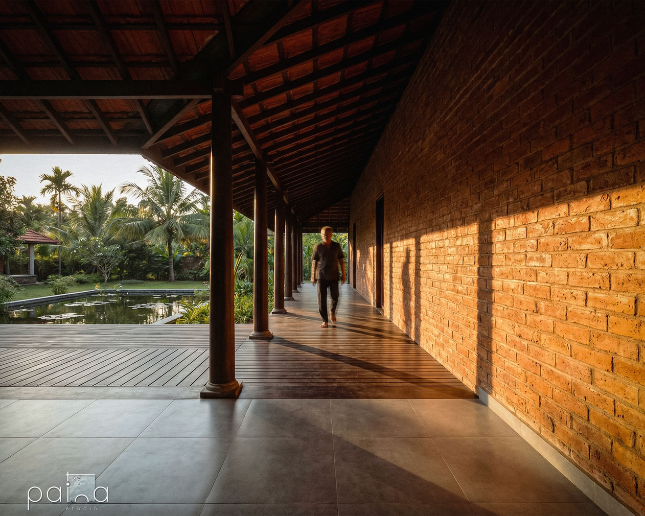 A warm, tropical-inspired space shaped by natural materials, open air, and soft sunlight. The design emphasizes brick textures, timber elements, and seamless indoor-outdoor flow, creating a grounded, tranquil atmosphere. Light and shadow move gently through the space, enhancing a sense of calm, simplicity, and connection to nature.